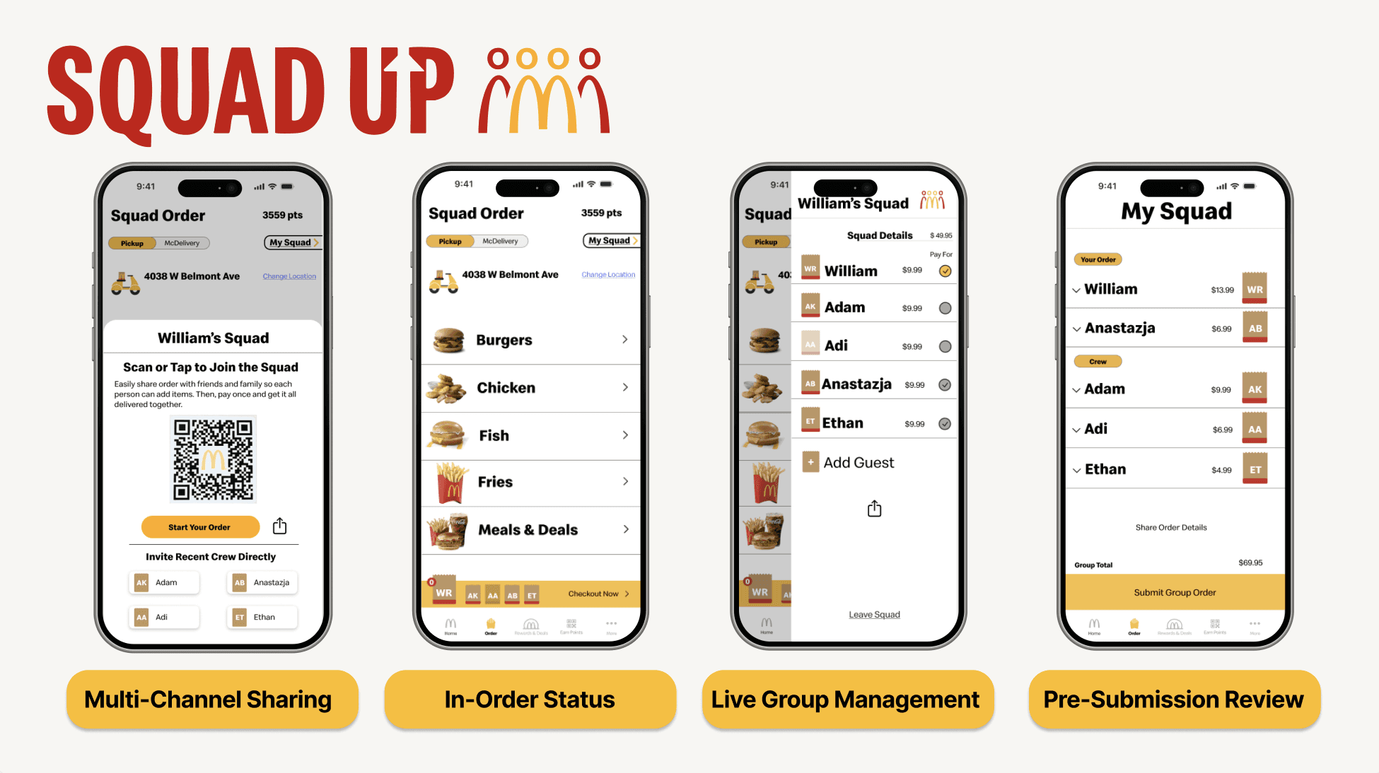 Squad Up is a collaborative group-ordering feature designed to simplify how teenage friend groups coordinate food orders within the McDonald’s mobile app. Users can invite friends via QR code or link, add items to a shared cart, track individual selections in real time, and review the full order together before checkout—reducing the coordination friction that often arises when one person orders for the group.